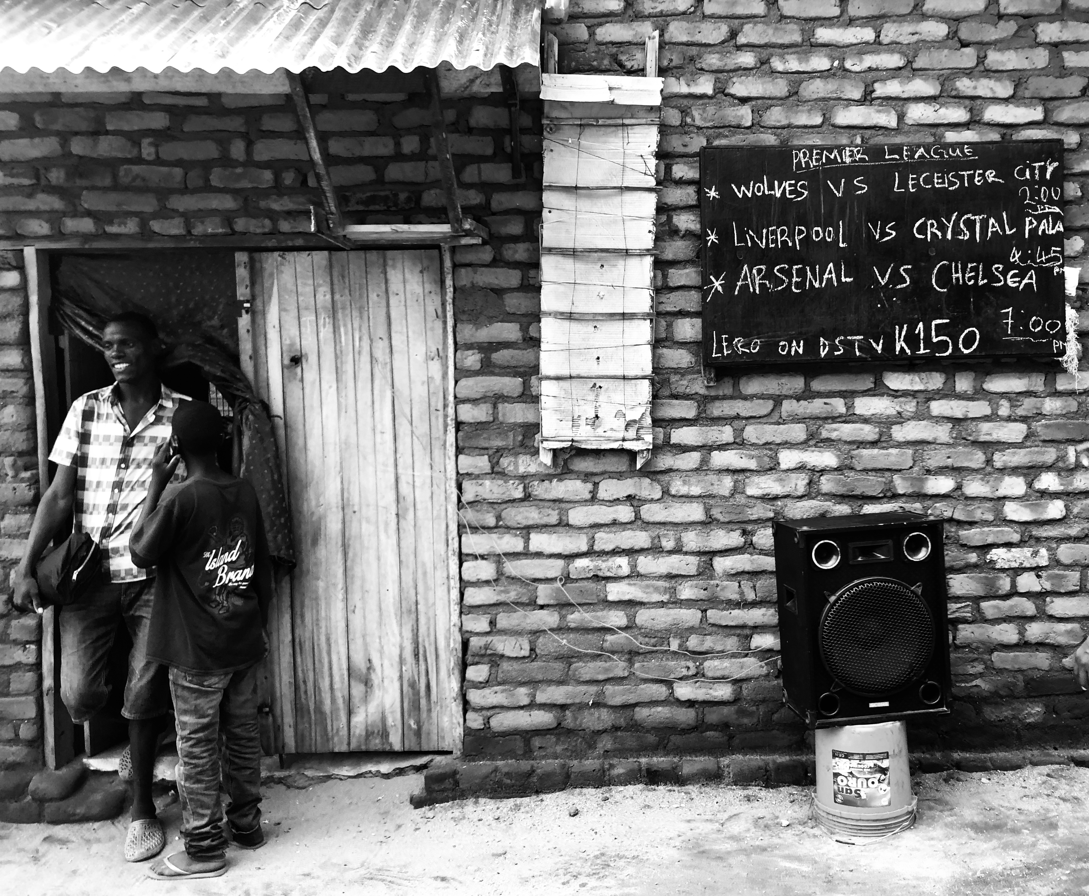 De rode klei is vochtig, maar deze grond heeft de bijzondere eigenschap niet aan je schoenen te plakken en nooit glibberig te worden. We kiezen voor de route langs het beekje, voorbij de bocht steken we over een gammele brugje van aan elkaar gebonden balken het stroompje over. Halverwege het maisveld, waarvan de planten al tot kniehoogte reiken, draaien we naar rechts. Het pad verandert in een dubbel spoor met aan weerszijden her en der bakstenen huisjes, de muren aangesmeerd met klei. De daken zijn van aluminium golfplaten. Een enkeling zit voor een hut die uit bamboe en riet is opgetrokken. Twee mannen onderbreken hun bao, een spel van kralen in kuiltjes in een houten bord, om ons te groeten. Veelkleurige chitenga’s en kleurloze shirts hangen in windstilte aan een lijn tussen twee bomen.